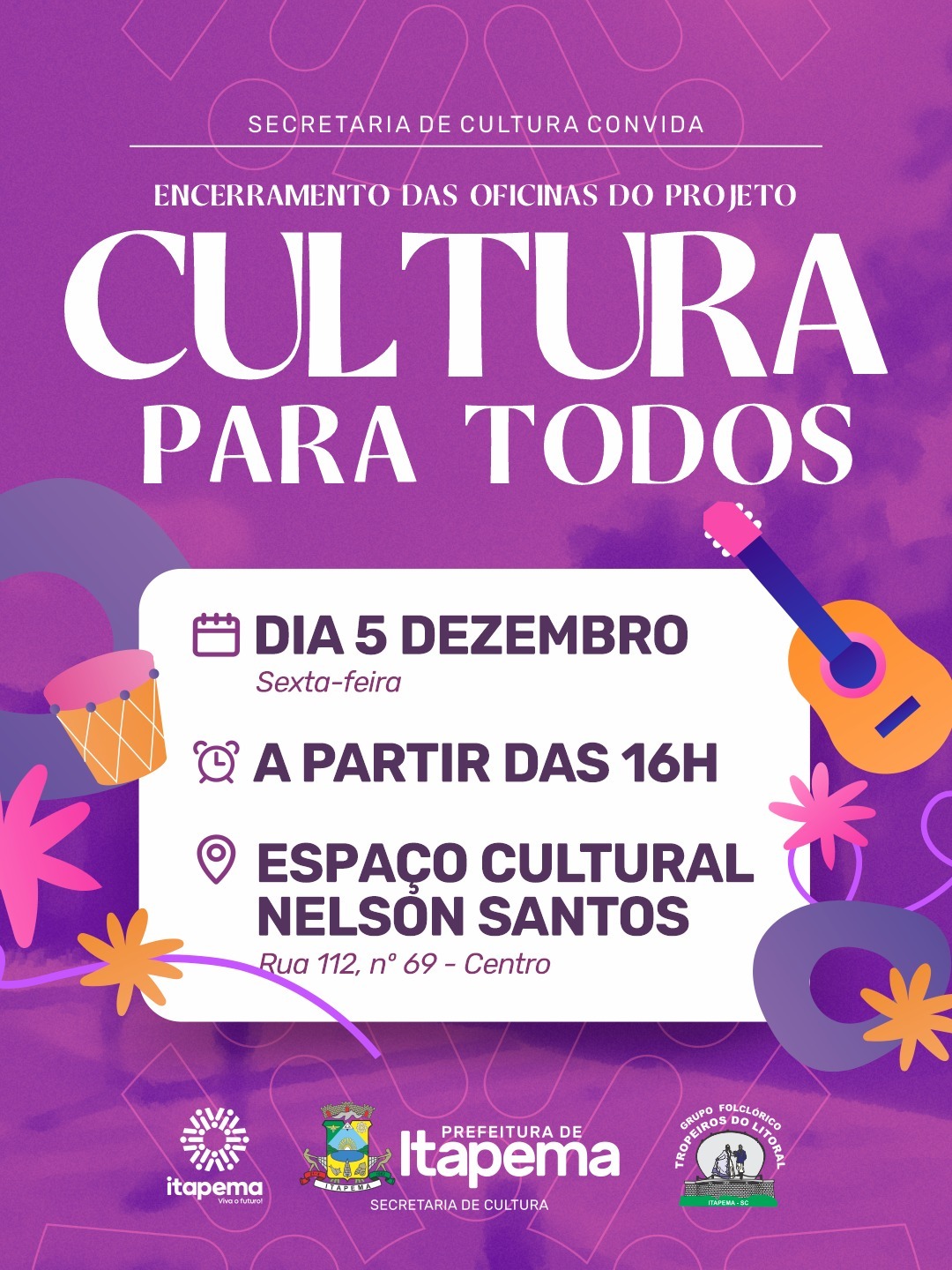 Evento promovido pela Prefeitura de Itapema, por meio da Secretaria de Cultura, O Projeto Cultura para Todos 2025 encerra suas atividades nesta sexta-feira, dia 05, no Espaço Cultural Nelson Santos, na Rua 112, nº 69 – Centro.