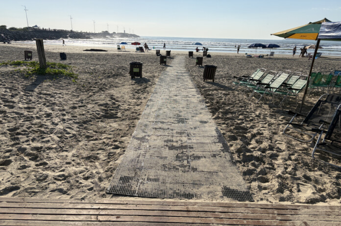 Grades plásticas de drenagem formam um trilho para acessibilidade à faixa de areia no Molhe da Atalaia, em Itajaí, facilitando o acesso de cadeirantes, idosos, crianças e pessoas com mobilidade reduzida, permitindo que cheguem à praia com segurança e conforto.