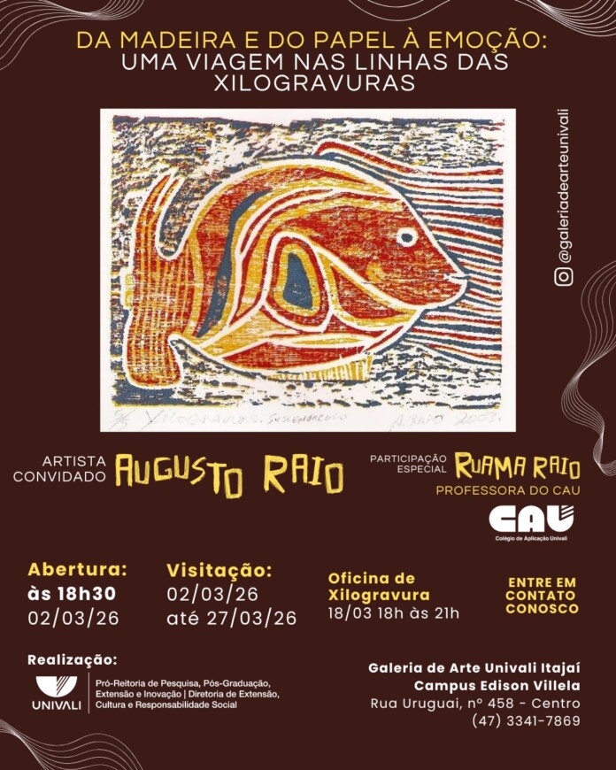 A Galeria de Arte Univali, no Campus Itajaí, apresenta a exposição “Da madeira e do papel à emoção: uma viagem nas linhas das xilogravuras”, do artista Augusto Raio, com abertura em 02/03/26 e visitação até 27/03/26. A mostra explora a xilogravura como técnica e linguagem cultural, destacando a interação entre matriz e papel.